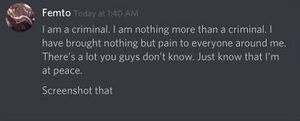 Little is known about Femto. It is known, however, that Femto was in a relationship with a girl who was a Hatsune Miku fan, for more than one year.